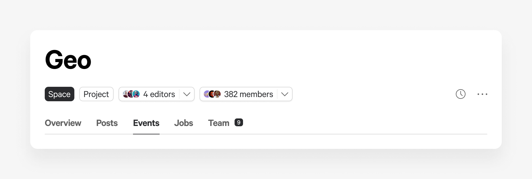 For example, if you created a project space, you’ll have a tab for an overview, team members, events, posts and jobs. Once you have created a space, you are free to create or curate any content you’d like.